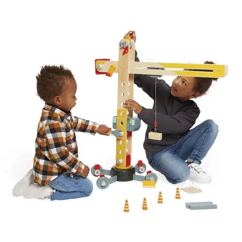 Con questa splendida gru in legno, i bambini dai 3 anni in su possono diventare veri capi cantiere e dirigere i lavori come dei professionisti!